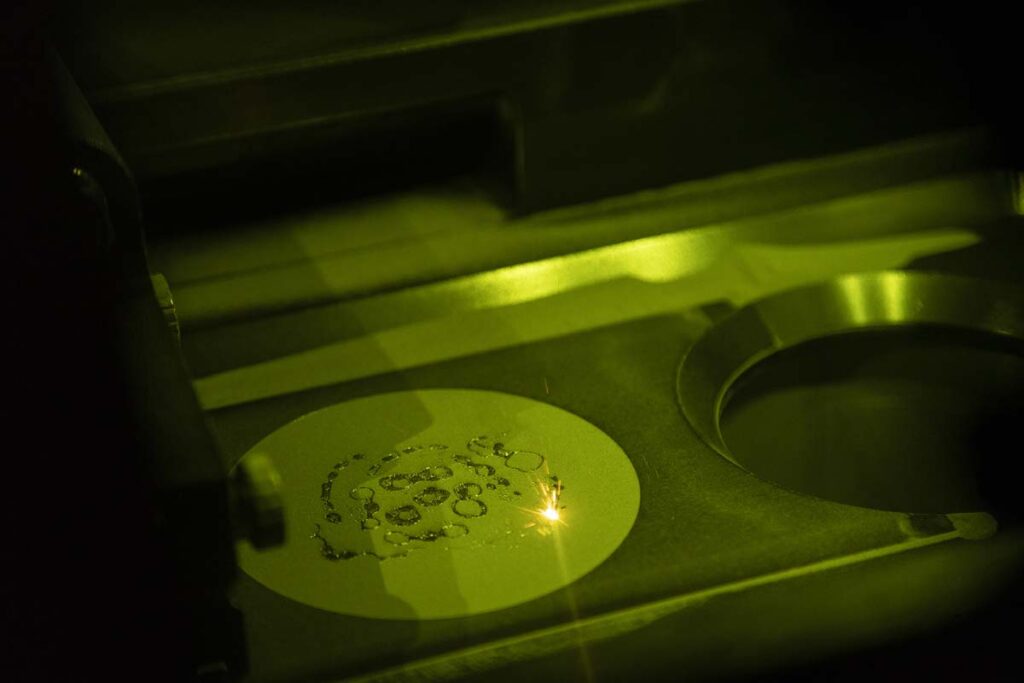Il Laser Melting crea dispositivi dentali fondendo strati di polvere metallica con un laser, seguendo un modello 3D, è preciso, sostenibile e riduce gli sprechi.